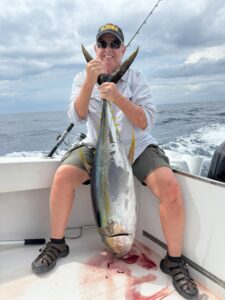On Monday, all four boats smacked yellowfin tuna. These were larger fish in the 75-110 lb range so they weren’t interested in chasing poppers, but live bait and chunked sardines did the trick. No one had any shame passing the rod off since it was only Day 1 and several tunas were brought to the boat after a team effort. I believe Oz’s 110 pounder was the biggest of the day.
